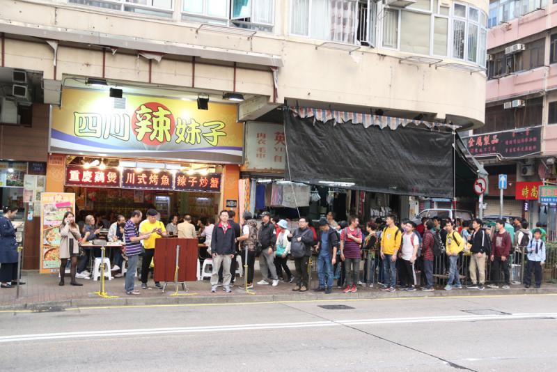 图:深水埗“四川辣妹子”接连遭暴徒破坏,但老板仍坚持撑警立场,获大批市民往光顾表示支持,昨日高峰期店外排了逾百人