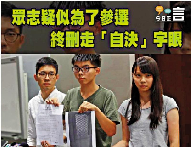“香港众志”日前在社交网站公布,把组织设立宗旨“推动香港民主自决”改为“推动香港的民主与进步价值”。距离立法会换届选举仅余九个月,“众志”这次宣布“转軚”,企图消“独”入闸的黄之锋之心,路人皆见。“众志”成员过去曾多次因“自决”政纲违反基本法,被取消选举提名资格,如今突然罕有地在一月举行成员大会(过往通常在四、五月)改政纲,背后的“众志”变脸记,你不能不知。\大公报记者 郝寿 段远峰