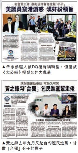 图:“众志”参选人被DQ后声称转型,但屡被《大公报》揭发勾外力乱港