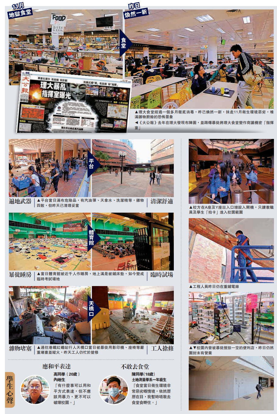 《大公报》记者昨日在理大人员带领下参观校园修复设施。最多人关心是邵逸夫楼食堂,《大公报》曾踢爆暴徒占据理大期间,该处属暴徒商议高度机密及用作“行军布阵”的指挥室,布告板上写有警告字眼“Canteen严禁拍照”。当时卫生情况极为恶劣,到处有发霉厨余及腐肉,滋生蛆虫并发出刺鼻恶臭。据了解,食堂曾经两次彻底消毒,更换所有厨具及餐具,记者昨重回“旧地”,感觉装修上焕然一新,惟座椅款式颜色不一,校方解释:“有好多(座椅)被取走堵塞或焚烧唔见咗,要临时借櫈返嚟。”