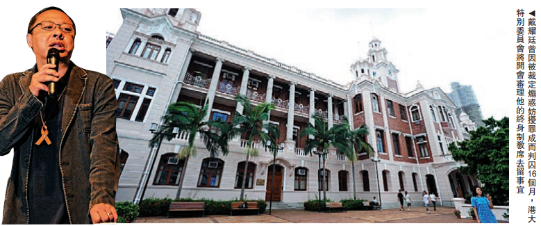 戴耀廷去年四月被判串谋作出公众妨扰罪、煽惑他人作出公众妨扰罪两罪罪成,被判监16个月,而港大在去年六月成立“探讨充分解雇理由委员会”,调查戴耀廷教席去留问题。据了解,委员会将会举行会议,以确认是否在戴耀廷完成上诉程序前启动审理解雇程序。