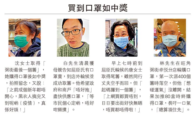 沈女士取得“弼街最后一个筹”,她购得口罩后如中奖,拍照留念,又说:“之前成个新年都唔开心,黑衣人搞完又到呢啲(疫情),真係好烦!”