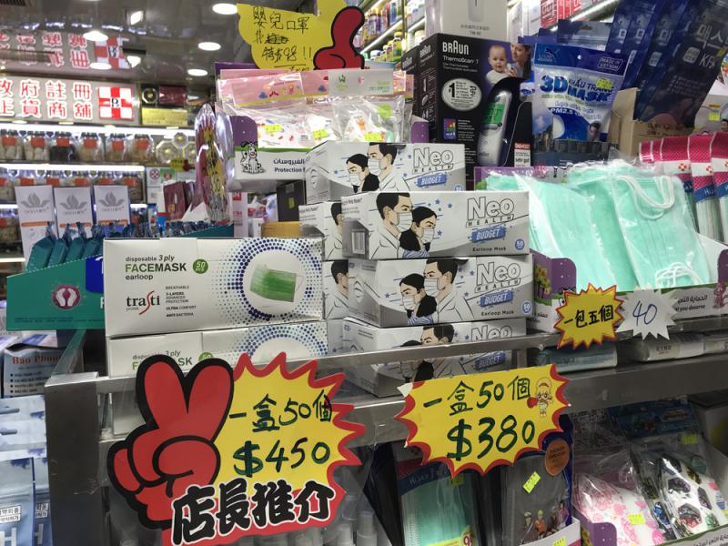 记者发现,目前普通医用口罩价钱由10元内至40元一个不等,其中在西洋菜南街一间药房有一批以普通胶袋包装但未有写明来源地的普通医用口罩,以5个装为一包的口罩已索价68港元,30个装则为188港元。若嫌未有完整包装的话,该药房亦有提供原装一盒的口罩,售价则为368港元。近期经常卖断市、韩国产的KF80口罩亦有大量货,其中在加拿分道一间药房,单个KF80口罩售价为28元,4个则为100元。