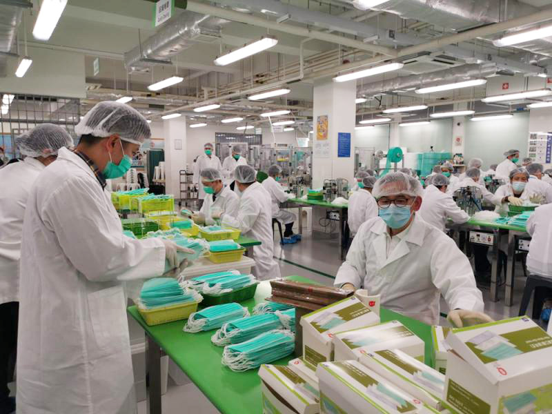 图:惩教署逾八百义工每天24小时赶制口罩,署长胡英明(右)连日落场做工人,将口罩包装入盒