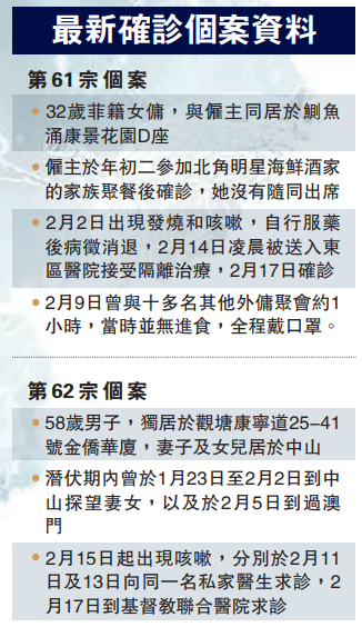 本港昨日新增两宗确诊个案,包括一名32岁的菲籍女佣,是本港首宗外佣确诊感染个案,其雇主早前在北角明星酒家29人的“团拜家族”聚餐后确诊。该菲佣于确诊前曾于2月9日在中环大会堂外与十多名外佣聚会,卫生防护中心正寻找相关外佣跟进,有雇主组织担心外佣会传染婴儿或长者。另一名新增确诊者为一名58岁男性,居于观塘康宁道金桥华厦,潜伏期曾到内地探望妻女。另外,本周日(2月16日)确诊的54岁太古城男患者,除妻子和同事外,其岳母亦初步确诊染疫。\大公报记者朱俊贤、谢莹莹