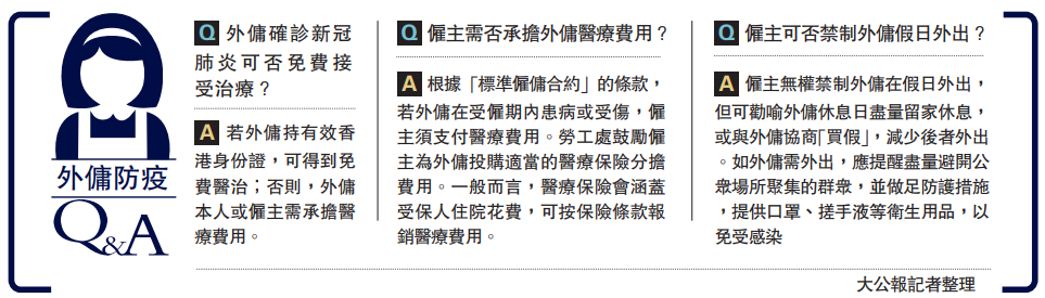 对于本港出现首宗菲佣确诊新冠肺炎个案,徐晓彤说,外佣喜欢在休假时进行聚会,不排除有其他隐藏确诊个案。她呼吁雇主在外佣出街时,向其派发口罩。