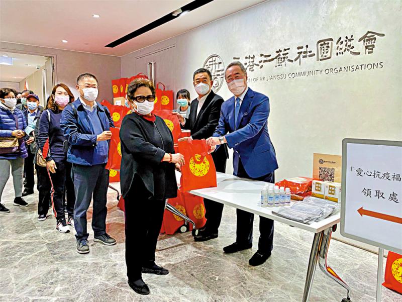 图:唐英年带领香港友好协进会、香港江苏社团总会成员把抗疫物资分发给市民