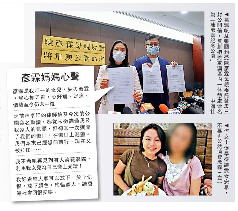 泛暴派炒作话题,要求把将军澳区内一休憩处命名为“陈彦霖纪念公园”。民建联立法会议员葛珮帆及张国钧获陈彦霖母亲何女士委托发表公开信,她表明反对把公园以其爱女命名,并指动议从没有谘询她和其家人的意愿,直斥泛暴派再次撕开她的伤口,“我不希望再见到有人消费彦霖,利用我女儿为自己套上光环”。\大公报记者 伍轩沛