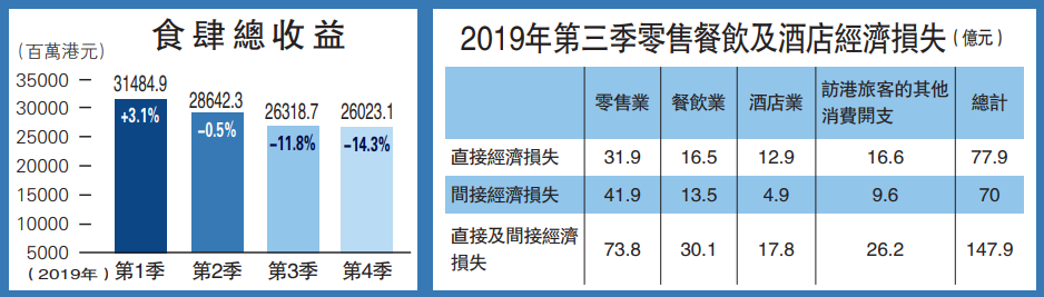 透过比较政府统计处2019年第二季和第三季的数据,政府经济顾问办公室估计,近期的修例风波令零售业销售总量、食肆总收益及酒店业收益,分别在第三季额外损失大约15、11及18个百分点。访港旅客人次由2019年第二季按年上升10.9%,急转至第三季按年下跌26%,亦令访港旅客的消费开支于第三季急跌。
