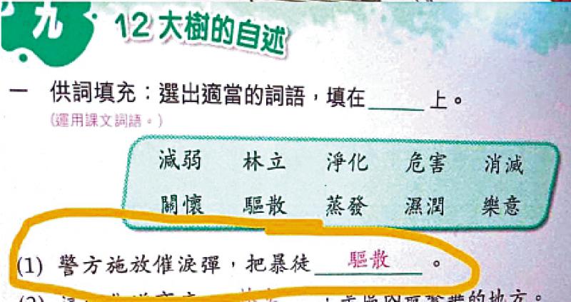 【大公报讯】记者唐川报道:小学教科书出现“警方施放催泪弹,把暴徒驱散”的内容,“香港众志”副主席郑家朗撑暴撑上脑,竟将之抹黑为“洗脑”教材。教育局发言人表示,有关作业早于2011年已出版,批评有团体故意以既定政治立场诠释作业内容,大做文章宣扬其主张,误导视听。