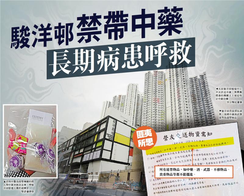 《大公报》向负责管理骏洋邨的民众安全服务处(民安队)查询当日注册中医处方的中药为何列作违禁品不获准送入检疫中心,该处昨晚回覆指民安队会代送进检疫中心的药物只包括由注册中/西医处方的药物及有注册编号的成药。