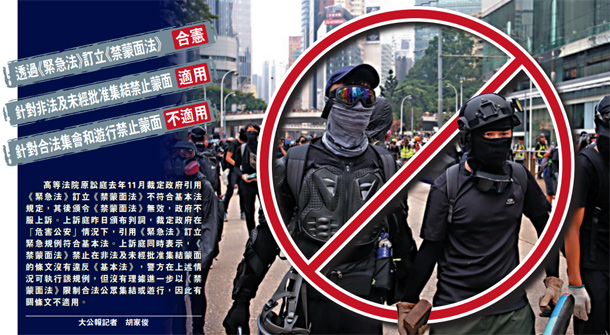特区政府去年10月引用《紧急法》订立《禁止蒙面规例》(《禁蒙面法》),以尽快恢复社会秩序,止暴制乱。其后,反对派就法例向高等法院提出司法覆核。去年11月,高等法院原讼法庭宣判《紧急法》部分内容不符合基本法的规定,并裁定“反蒙面法”部分条文无效及不具法律效力。特区政府不服判决,提出上诉。