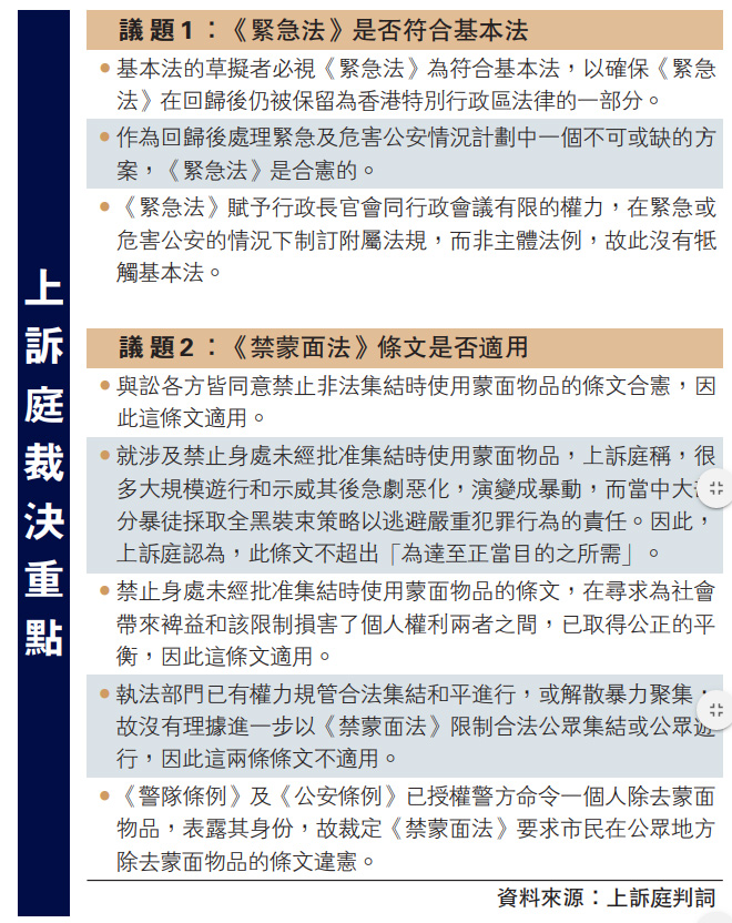 高等法院原讼庭去年11月裁定政府引用《紧急法》订立《禁蒙面法》不符合基本法规定,其后颁令《禁蒙面法》无效,政府不服上诉。上诉庭昨日颁布判词,裁定政府在“危害公安”情况下,引用《紧急法》订立紧急规例符合基本法。上诉庭同时表示,《禁蒙面法》禁止在非法及未经批准集结蒙面的条文没有违反《基本法》,警方在上述情况可执行该规例,但没有理据进一步以《禁蒙面法》限制合法公众集结或游行,因此有关条文不适用。\大公报记者 胡家俊