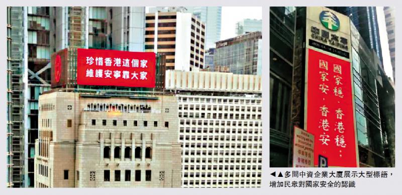 图:多间中资企业大厦展示大型标语,增加民众对国家安全的认识