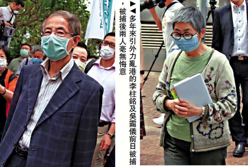 图:多年来引外力乱港的李柱铭及吴霭仪前日被捕,被捕后两人毫无悔意