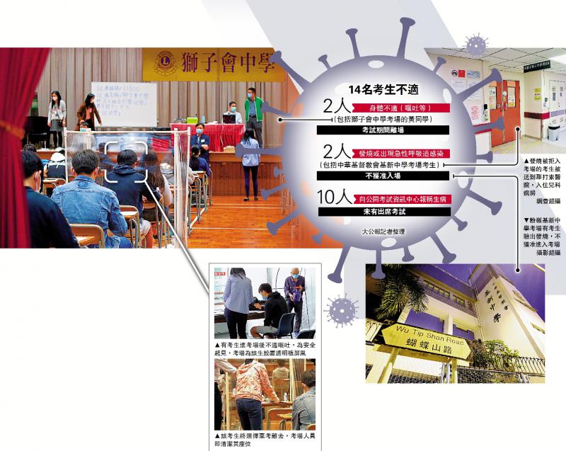 中学文凭试(DSE)昨日踏入第二日,考综合科学、化学及组合科学(化学)三科,共有1.3万名考生应考,14名考生因身体不适未能顺利应试。位于粉岭中华基督教会基新中学试场的一名考生在入考场时两度被测出发烧,由救护车送往医院,照出“肺部有花”,正留院等候新冠肺炎病毒检测结果。卫生防护中心传染病处主任张竹君表示,由于考生未入试场,应该不会有互相接触,相信即使这名考生确诊,也不会影响其他考生。考评局指出,会密切与教育局及卫生防护中心保持紧密联系,监察疫情发展,采取适切及适时的跟进。\大公报记者 练怡兰、朱俊贤、汤嘉平