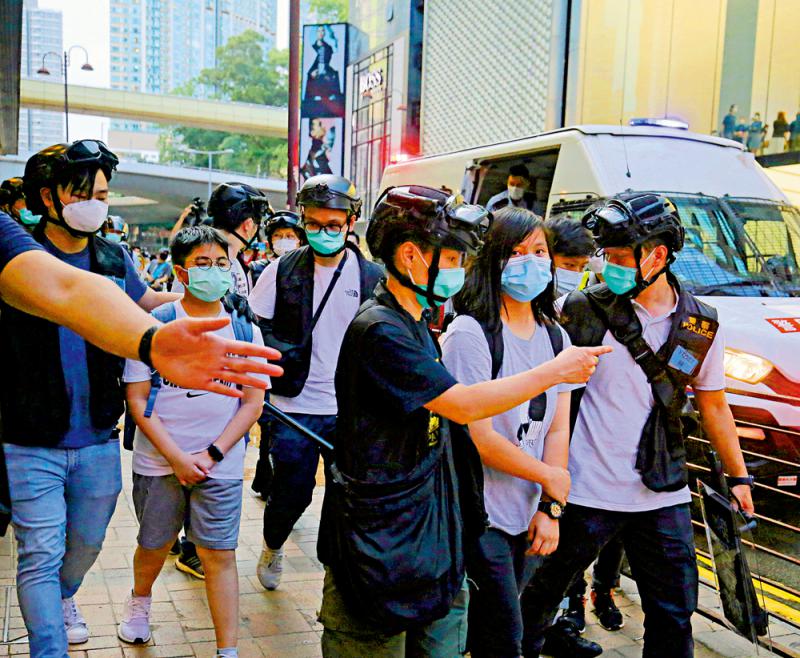 图:警方前日在尖沙咀海港城带走一名年仅十二岁、声称自己为“学生义务记者”的男童(左二),事件引起社会广泛关注\资料图片