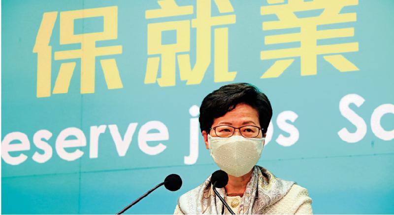 图:林郑月娥宣布,已大致敲定保就业计划细节,合资格雇主可以由本月二十五日开始申请,第一期的工资补贴涵盖六至八月\大公报记者马丁摄