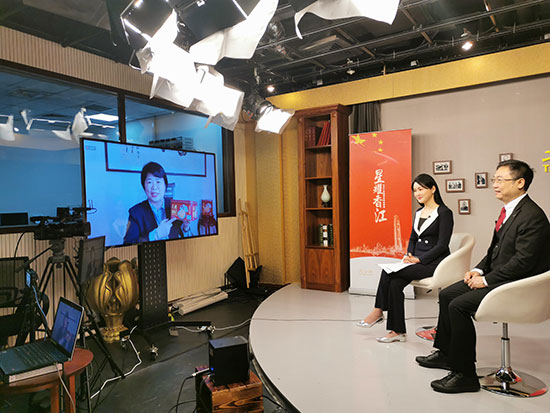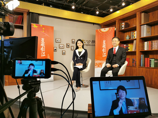 珠海元朗食品有限公司联席董事长兼总裁伍素萍做客由大公网和香港贸发局联合打造的2021全国两会特别报道,对话特邀嘉宾主持、香港贸发局中国内地总代表钟永喜。(大公网记者 李晓蓉摄)