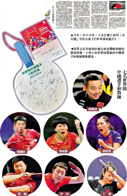 2月16日,《大公报》副刊“大公园”刊发了朱昌文的《打乒乓球的魅力》。文中写道,上世纪六七十年代,当时的世界冠军中国队多次莅临香江,在九龙伊馆(即现时的麦花臣场馆)表演。1971年参加名古屋世乒赛荣获四项锦标的中国队,应香港乒乓球总会之邀请,於4月和5月分两批访港。当年在《新晚报》做记者的朱昌文,接到“柯打”採访这宗新闻,除了近距离见到徐寅生、莊则栋、李富荣、张燮林等多位偶像,还準备了平时用惯的球板,请所有在场的球手在上面签名,以作留念。由於错买了易褪色的水质笔,导致球板上的签名受到汗水所湿逐渐变得模糊不清,以至造成他难以忘怀的遗憾。