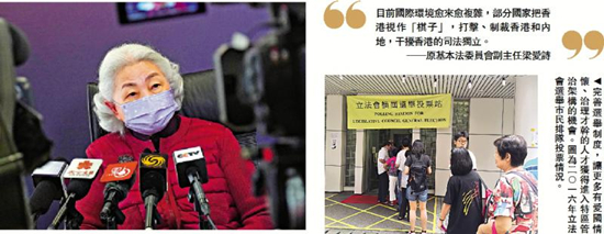 梁爱诗说,“一国两制”方针始终得到中央支持,多年来总体落实良好,然而近年出现了问题,必须用新办法化解。目前国际环境愈来愈复杂,部分国家把香港视作“棋子”,打击、制裁香港和内地,干扰香港的司法独立。为杜绝伤害国家和香港特区的人佔据特区公职,避免特区管治权落入反中乱港者手中,防止国外反华势力和本地反中乱港分子勾结、危及国家安全、伤害香港市民,必须完善特区选举制度,从法律制度上落实“爱国者治港”原则。她相信,广大市民对此能够理解。
