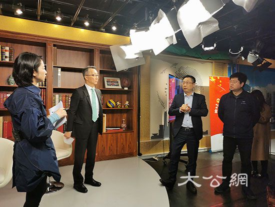 图三:锺永喜(右二)在大公网演播室与采访组沟通访谈事宜,大公报社长助理、大公网执行总裁兼总编辑王文韬(右一)陪同/记者 李晓蓉摄