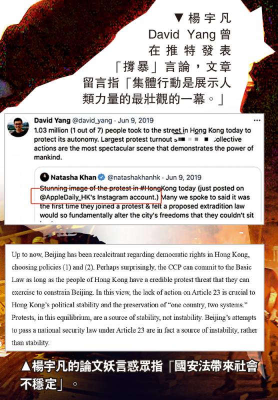 与张忆芹撰写多篇研究论文的杨宇凡David Yang,现为哈佛大学经济学助理教授。《大公报》记者发现其“研究成果”多涉及社会抗争,其中一篇于2017年在英国伦敦政治经济学院网站上发表的反中论文,污蔑中国政府,并煽惑“港人的抗议达到威胁程度,就可抗衡北京”云云。