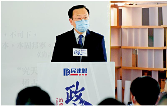 图:何靖前日出席民建联首届“政道︱治政理念研习课程”开学礼,致辞时提到从政者必须是坚定的爱国者。