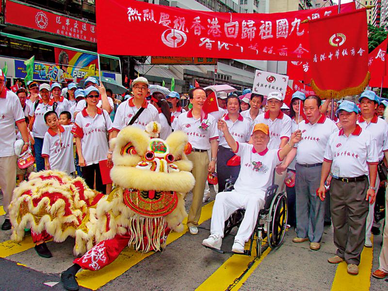 图:二○○六年七月一日,曾宪梓虽然需要坐轮椅,但亦亲自参加庆祝香港回归祖国九周年的大巡游,并手舞国旗、区旗,喜形于色。