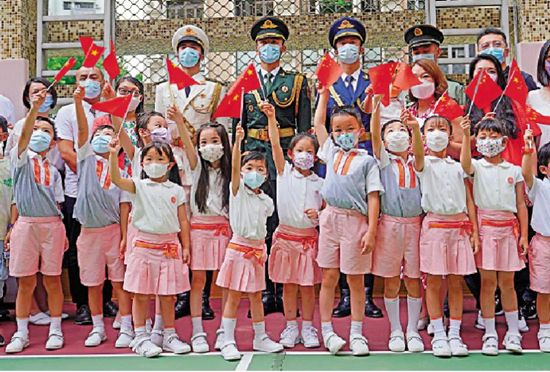 图:为庆祝中国共产党成立100周年暨香港回归祖国24周年,香港教育工作者联会与香港升旗队总会昨日邀请解放军驻港部队三军仪仗队来到培侨中学主持升旗仪式。\中新社