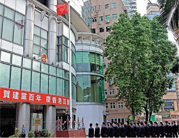 昨日上午七时,升国旗仪式开始,中联办全体参加人员齐声高唱国歌,祝福中国共产党百年华诞及庆祝香港回归24周年。