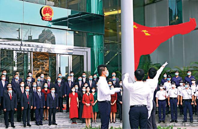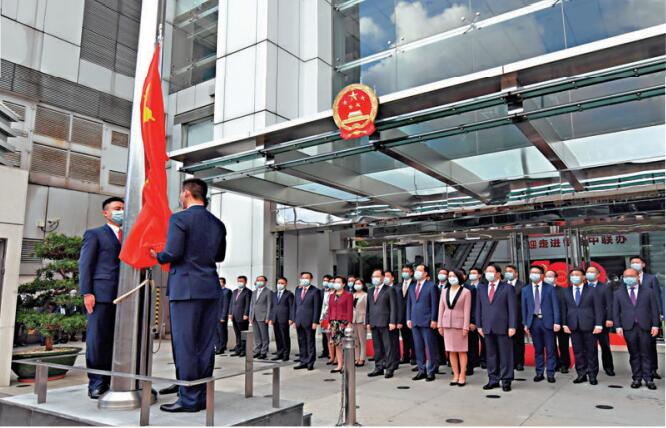 在外交部驻港公署,由三名青年外交官组成的护旗队整齐划一、步伐有力、手捧国旗走向升旗区,迎风送展五星红旗,全场肃立行注目礼,齐声高唱国歌。外交部驻港公署特派员刘光源带领全体署领导、署员等人参加。