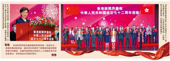 图:左图:特首林郑月娥强调,香港国安法实施后,市民的人权和自由丝毫不受影响,新闻自由继续得到基本法和其他本地法例保障。右图:香港新闻界庆祝中华人民共和国成立七十二周年酒会昨日举行。行政长官林郑月娥、中联办副主任卢新宁等一众嘉宾出席开幕仪式。