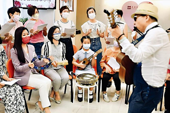 图:中联办副主任卢新宁与“情绪疏导 音乐分享”课程学员合唱歌曲。