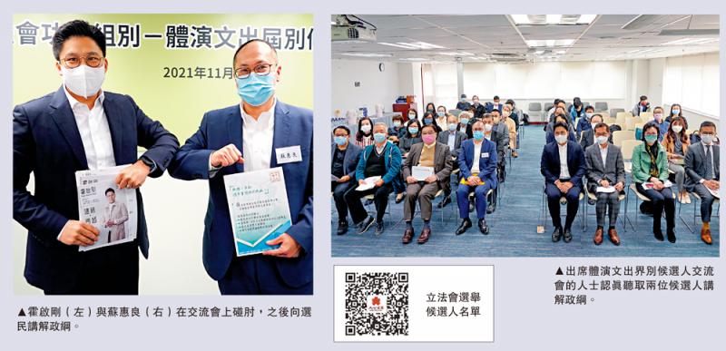 立法会选举将于12月19日举行。香港出版总会昨日举办“立法会功能组别——体演文出界别候选人交流会”,邀请参选体演文出界的两位候选人霍启刚和苏惠良,向选民讲解政纲。两位候选人积极讲解对业界政策的看法,霍启刚倡议打造文体城市,希望以多元化产品发展文化及体育。苏惠良则建议特区政府尽快落实“文化体育及旅游局”,并推动本港的阅读之风。