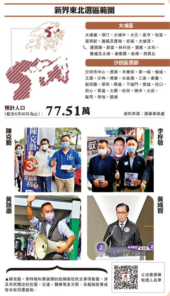 这次立法会选举的新界东北选区包括大埔区和沙田区西部,共有选民约78万人。区内有商业繁荣的市镇中心,亦有风景秀丽的郊野地带,还有香港中文大学、香港科技园等创科重地。这次共有四位候选人竞逐该选区的两个议席,包括新民党李梓敬,自称独立候选人黄成智,现任立法会议员、民建联陈克勤,和民主思路黄颕灏。