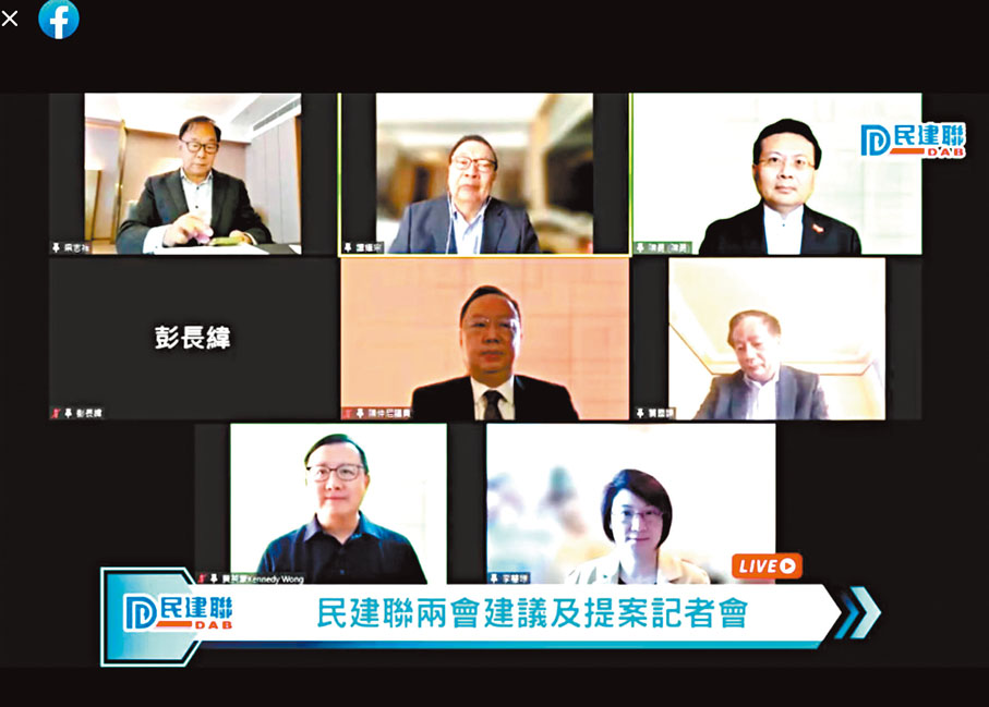 民建联举行视像记者会,介绍今次全国两会共21项建议和提案,希望推动两地合作与国家发展。直播截图