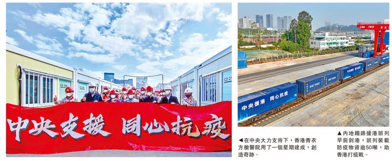左图:在中央大力支持下,香港青衣方舱医院用了一个星期建成,创造奇迹。右图:内地铁路援港班列早前到港,班列装载防疫物资逾50吨,助香港打疫战。