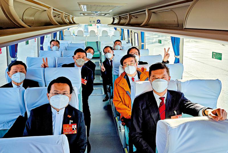 图:港区全国人大代表团乘车前往人民大会堂,出席十三届全国人大五次会议开幕。