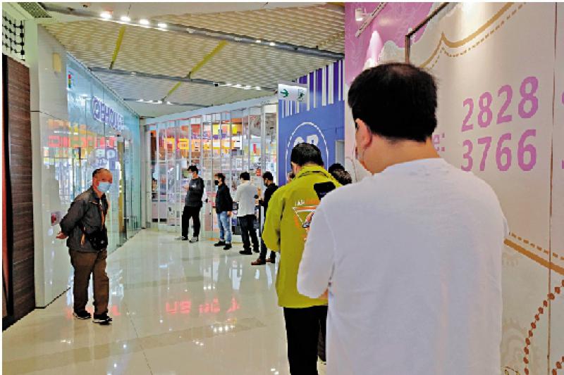 有得剪发喇!发型屋昨日解禁重开。北角一间连锁快剪店等候区全部坐满,店外更有数名客人分散站在不同位置等候,三名理发师密密手剪。记者先后在下午3时及傍晚6时到场观察,取筹编号从512变为551,即是3小时内服务了40位客人。新蒲岗另一速剪店外更出现人龙(见图),排队者清一色男士,人人都自觉隔开些少排。