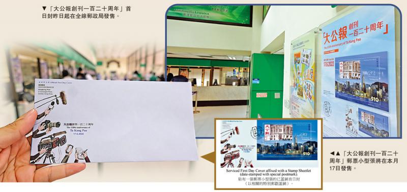 全线邮政局和网上购物坊“邮购网”从昨日起,已经开始发售“大公报创刊一百二十周年”正式首日封,每个售价2元5角。而邮票小型张及相关邮品则由6月17日起,在各邮政局及“邮购网”发售,而贴有邮票小型张的已盖销首日封,只限在集邮局发售,有兴趣的市民要抓紧机会收藏了。