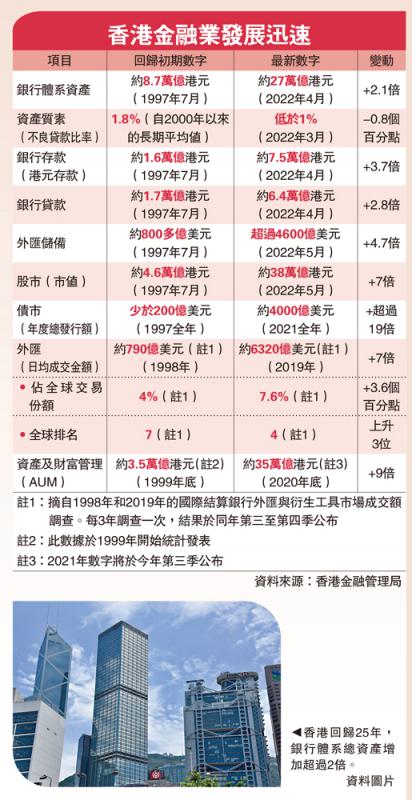 整体而言,余伟文认为,在过去25年的发展历程中,香港的国际金融中心地位一直保持增长、更加稳固,作为接通内地与国际市场的桥梁角色也更加吃重;其间虽然曾经历大大小小的各种变化或金融周期演变,市场起起跌跌,甚至有不同的危机爆发,本港的金融系统“都保持得非常稳定、有韧力”。