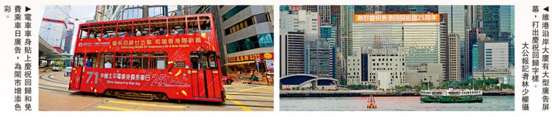 图左:电车车身贴上庆祝回归和免费乘车日广告,为闹市增添色彩。图右:维港沿岸大厦有大型广告屏幕,打出庆祝回归字样。\大公报记者林少权摄