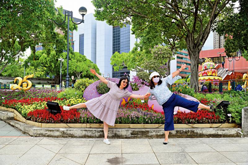 图:随着香港回归祖国25周年纪念日临近,沙田街头庆回归气氛更浓,图为市民与庆回归装饰合影。\中新社