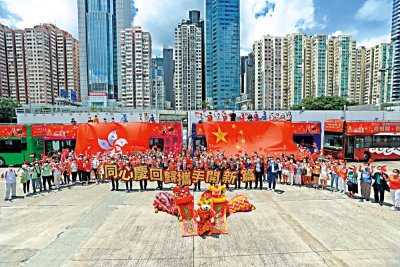图:香港岛各界联合会于西环举行“庆祝香港回归祖国25周年巴士巡游”起步礼,展示巨型中国国旗和香港区旗。\中通社