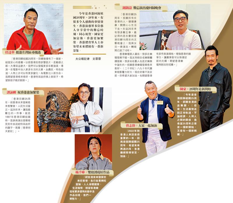 “香港回归祖国25周年,回归后像有了一个家,给我安心的感觉。以前香港拍很多警匪片,是动感之都。大湾区这么大,我们可以发掘更多年轻演员、导演,在电影中加入更多生活的元素,如农民、特色街道,人物上亦可以有更多变化,为电影注入新生命。我期望香港愈来愈好,香港特区政府换上新班子,希望新班子敢于创新。”