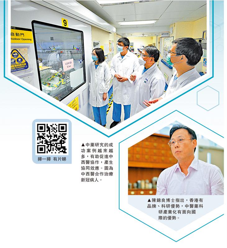 上图:中药研究的成功案例越来越多,有助促进中西医协作,产生协同效应。图为中西医合作治疗新冠病人。下图:陈锦良博士指出,香港有品牌、科研优势,中医药科研产业化有面向国际的优势。