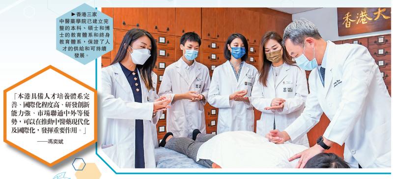 冯奕斌23年前来香港发展,他形容自己是赶上了香港发展中医药的好时机,因为香港回归后,特区政府不断“加码”推动中医药发展,在多方面均取得成果。他举例,人才培训方面,香港回归后建立了三家中医药学院,形成完整的学士、硕士和博士教育体系,以及终身教育体系,保证了本港中医药人才的供给和可持续发展,研究型人才更是由输入走向了输出;医疗服务方面,政府推动成立了18家由三方协作的中医诊所暨教研中心,奠定了中医基层医疗网络,而筹建中的香港中医院将于2025年投入使用,使中医保健与医疗渐趋多元化。