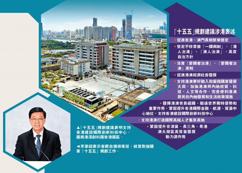 李家超表示,今年是“十五五”开局之年,香港也要有相应安排,要主动争取对接国家发展给予香港的庞大机遇。他指出,“十五五”规划建议中重点提及香港,包括支持香港巩固提升国际金融、航运、贸易中心等传统优势领域,更表明支持香港建设国际创新科技中心,相信透过发展高新科技,能为香港以至国家经济增值。
