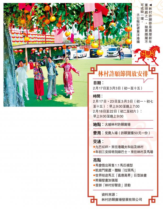 今年的大埔林村许愿节将于农历年初一起,一连15日于林村许愿广场举办。大会将继续举办新春市集,设72个摊位,提供干货、美食及摊位游戏等,并向公众展示由马会借出的两只1:1马匹模型,以及设置凯旋门供市民体验“拉头马”,现场亦会展出世界短途马王“嘉应高昇”巨型油画。